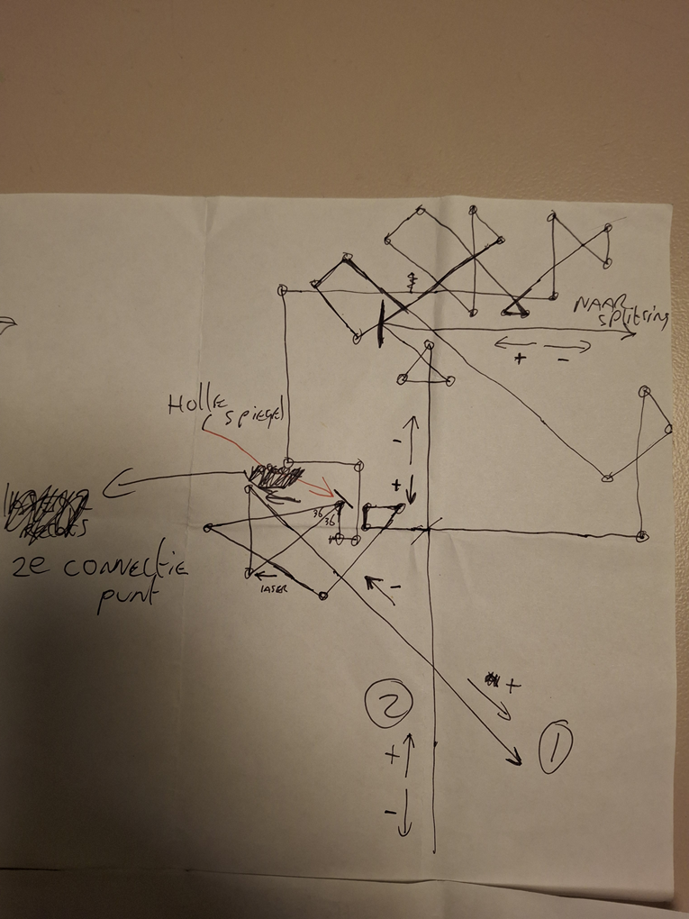 Ik heb aangegeven dat holle of bolle spiegels moeten, dus kruislingsdoortrekken en bundelen naar binnen, maar het kan ook via rechte spiegels, holle of bolle spiegels zouden beter zijn ivm reflectie en refractie, maar rechte spiegels kunnen waarschijnlijk ook hun werk doen... Alleen dus anhouden dat de middelste straal niet recht op de rechte spiegel komt, anders zal de lichtstraal terugkaatsen, dat is dus een praktisch probleem... Toevoeging: 21/03/2026, 21:20 Hier post ik twee afbeeldingen van mijn schets van de circulatie van deze plasma electrische veld bestemd voor de plasma electrische ontladings laser. Als gas wordt gebruikt, zullen dus + ionen naar tegenovergestelde richting bewegen, richting het circulerend gebied. De minus ionen zullen in de laser richting worden gestuurd naar het doel. Het idee is dus dat zodra minus ionen of electronen worden afgevoerd, dat dus + ionen aan worden getrokken... Deze + ionen komen vanaf boven bij de eerste laser. Daar wordt een gas of reagens in de laser gebrand en daarna zullen + ionen terug worden aangetrokken omdat minus naar voren beweegt... De + ionen circuleren tussen het gebied aangegeven met 1 tot en met 4. Via een ingewikkelde route zal de minus het systeem verlaten. Het plusgebied zal zorgen voor tegenkracht/ballast voor het mingebied afkomstig van de twee lasers. Een van de lasers wordt ergens onderaan afgevuurd en eentje vanaf de splitsing... U ziet de eerste afbeelding, die overigens iets moet worden gecorrigeerd, dat zal ik snel doen. Daar zie je twee lasers in elkaar overvloeien. Bedenk dus dat de laser op links wegvalt en dat dus daarvandaan de + ionen komen. De laser op links wordt dus doorgetrokken en van onderen afgevuurd. De minus circuleert over heel de